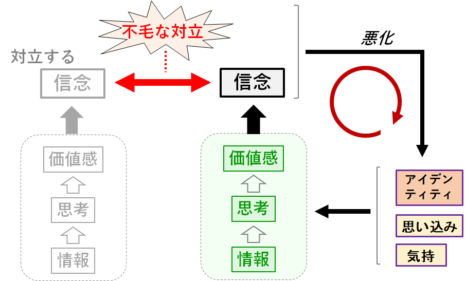 ⇒不毛な信念対立によって要素が悪化し、不毛がますます進む